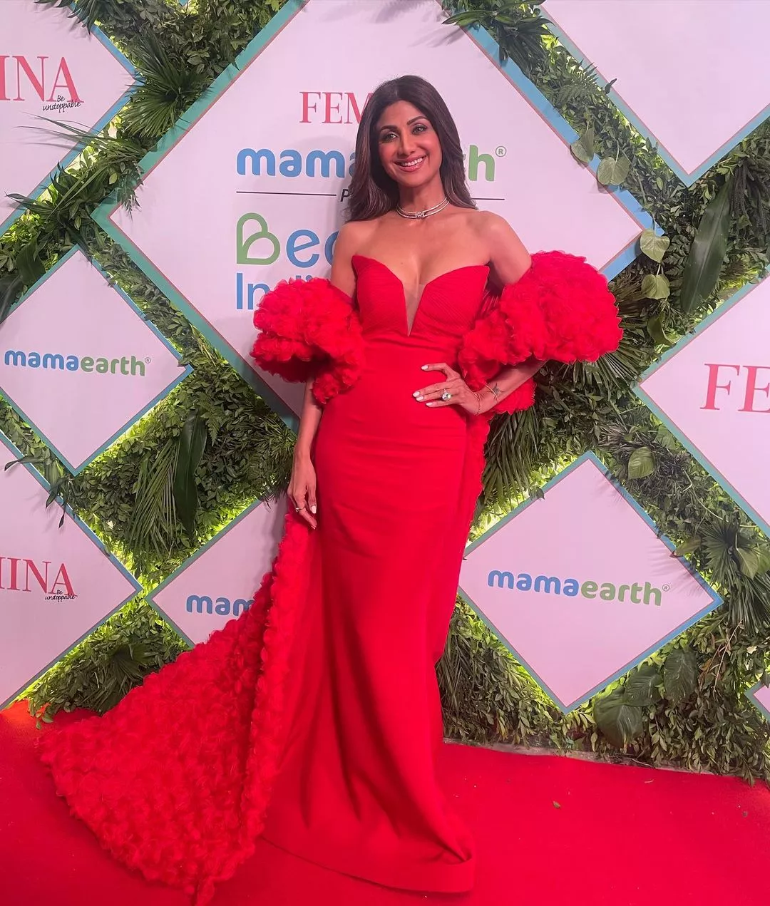 Recently, Shilpa took our breath away with her gorgeous red-hot look. For the Femina Mamaearth Beautiful Indians 2024 event, Shilpa picked a red-hued plunging neckline bodycon gown, and it was accentuated with a statement 3D flower cape with a long trail. Shilpa kept her look subtle with soft eyes, nude lips, and defined brows. She ditched the earrings and picked a dainty neckpiece that added stars to her look.