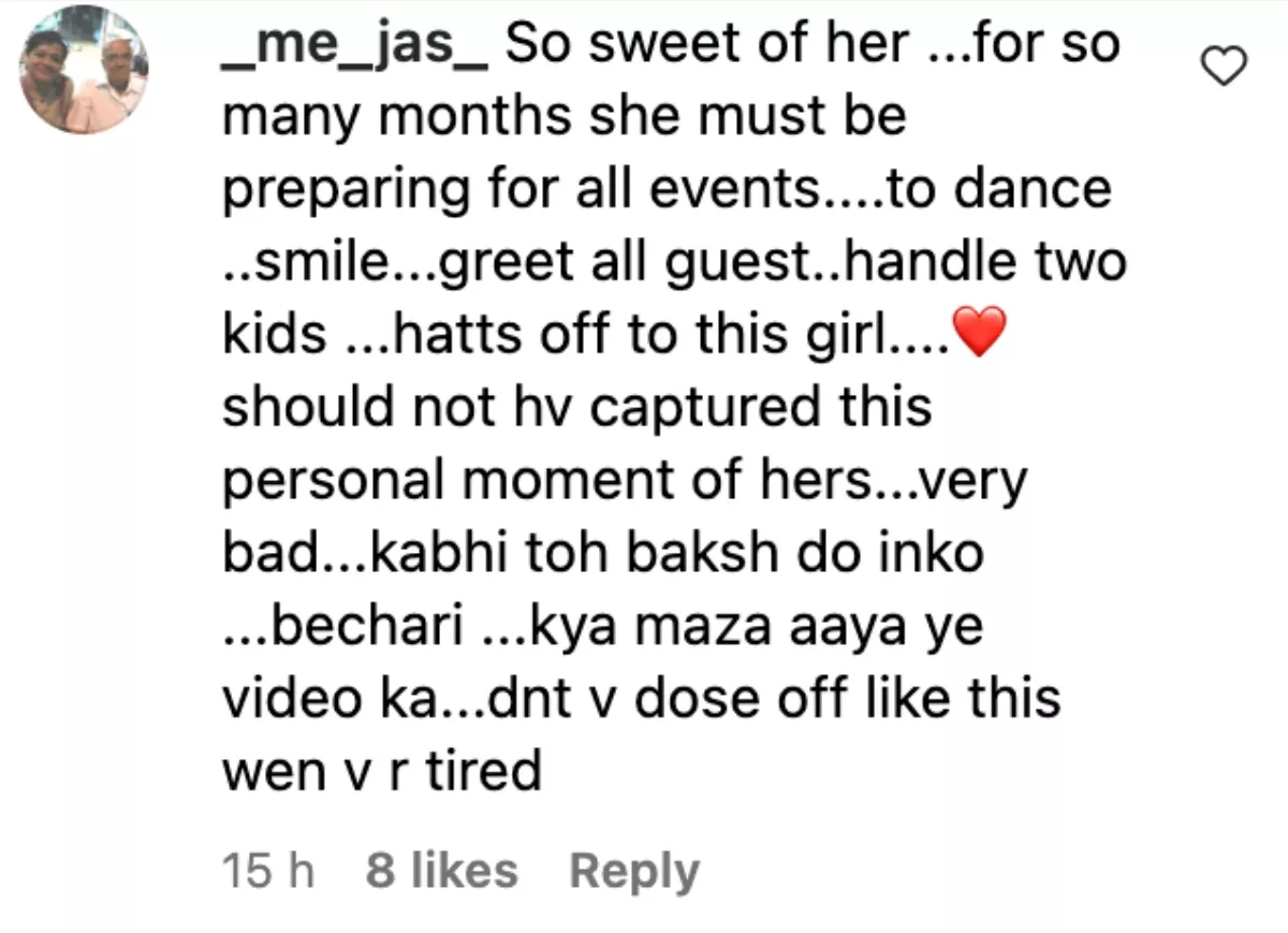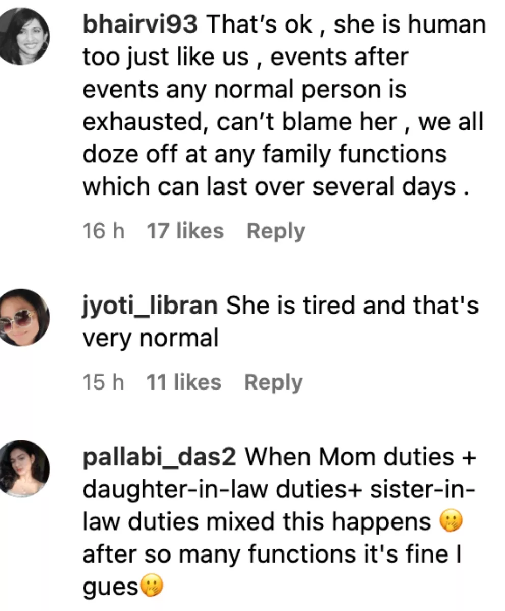 Another one commented, "That’s ok, she is human too, just like us, events after events, any normal person is exhausted, can’t blame her, we all doze off at any family functions which can last over several days." One of the netizens also wrote, "When Mom duties + daughter-in-law duties+ sister-in-law duties mixed this happens after so many functions it's fine I guess."