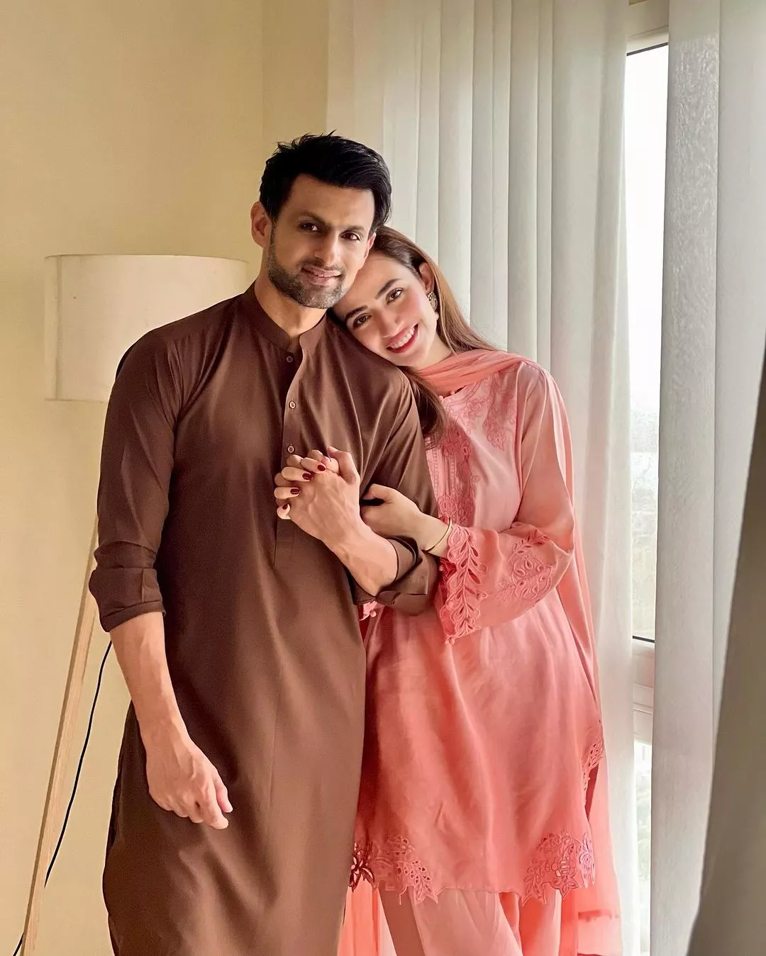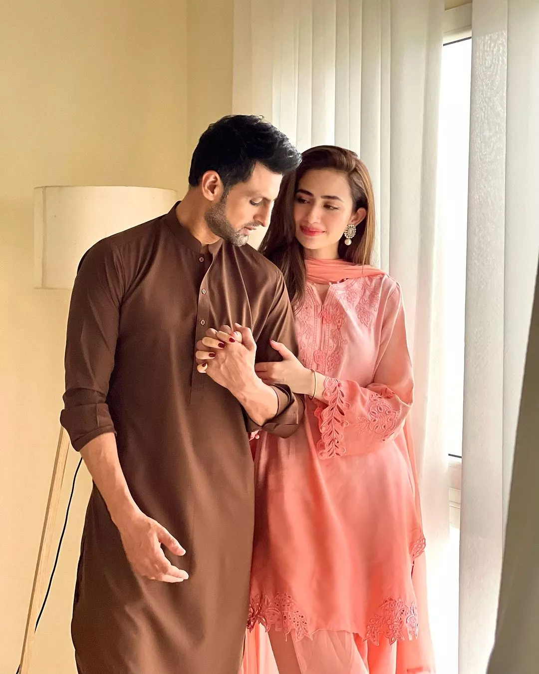 On June 17, 2024, Shoaib and Sana celebrated Eid Al-Adha together. The Pakistani actress shared lovely glimpses from the same. In the first photo, we can see Sana holding her husband, Shoaib's hand and looking at him with her eyes full of love. Talking about her look, she donned a peach-toned laser-cut kurta with a pair of tulip pants. She accentuated her look with dewy sheen makeup, pink lips and pin-straight hair.
