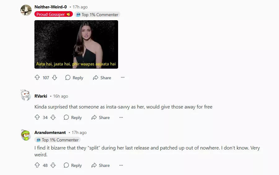 Netizens have been quick to react to Shraddha's cryptic posts. A Reddit thread discussing the Instagram story was flooded with comments ranging from curiosity to outright humour. One user wrote, “Kinda surprised that someone as insta-savvy as her, would give those away for free”. Another commented: “I find it bizarre that they “split” during her last release and patched up out of nowhere. I don’t know. Very weird”. One comment read: "She’s making us all ulooo with this mystery romance."