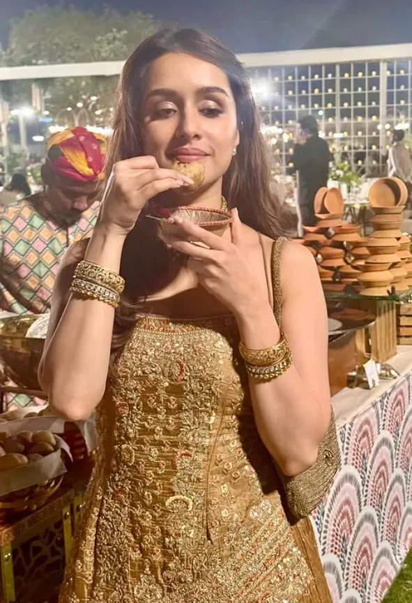 Interestingly, Shraddha also posted a few pictures from the wedding, one of which showed her relishing pani puri in an embroidered mustard yellow sharara set. Her caption read:
