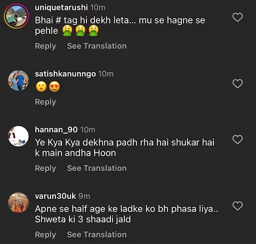 As soon as the picture was shared online, netizens were quick to react to the same. They flooded the post's comment section and started asking if Shweta and Varun were dating each other. A user commented, "Ye iska Naya wala hai kya..?? Teesra.." Another penned, "Apne se half age ke ladke ko bh phasa liya.. Shweta ki 3 shaadi jald." A third user commented, "Ye Kya Kya dekhna padh rha hai shukar hai k main andha Hoon."