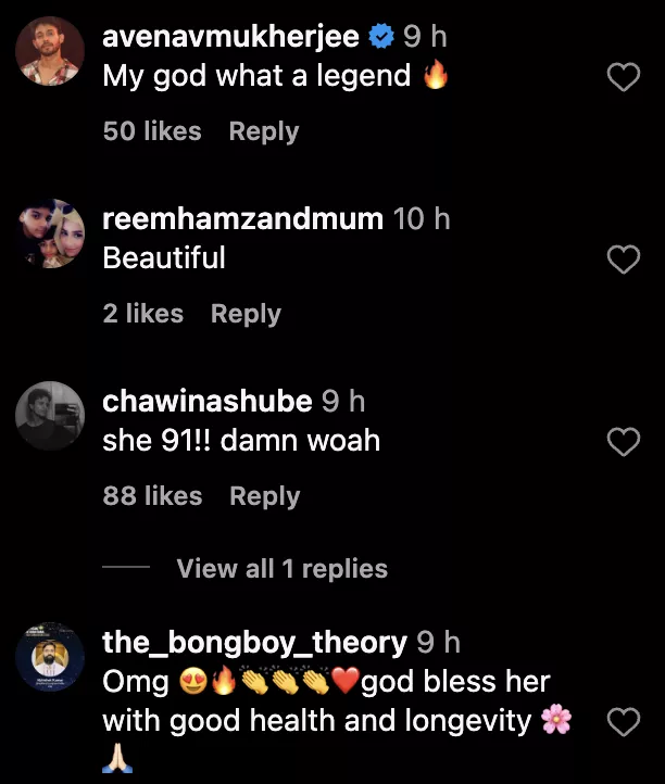 Asha Bhosle left netizens and celebrities floored with her charming rendition of Karan Aujla's Tauba Tauba, and they couldn't resist flooding the video's comment section with praises for her. Actor, Neil Nitin Mukesh penned, "legend for a reason. God bless tai," while actress, Elli Avram wrote, "What a true artist she is legend!" Music composer and director, Palaash Muchhal also dropped a heart and high-five emoji in the comments, while singer, Aditi Singh Sharma commented, "HOW cute is this Cannot believe she is 91 & killing it with the singing & dance moves." One fan even hilariously tagged Karan Aujla in their comment, penning, "@karanaujla you got a competition."