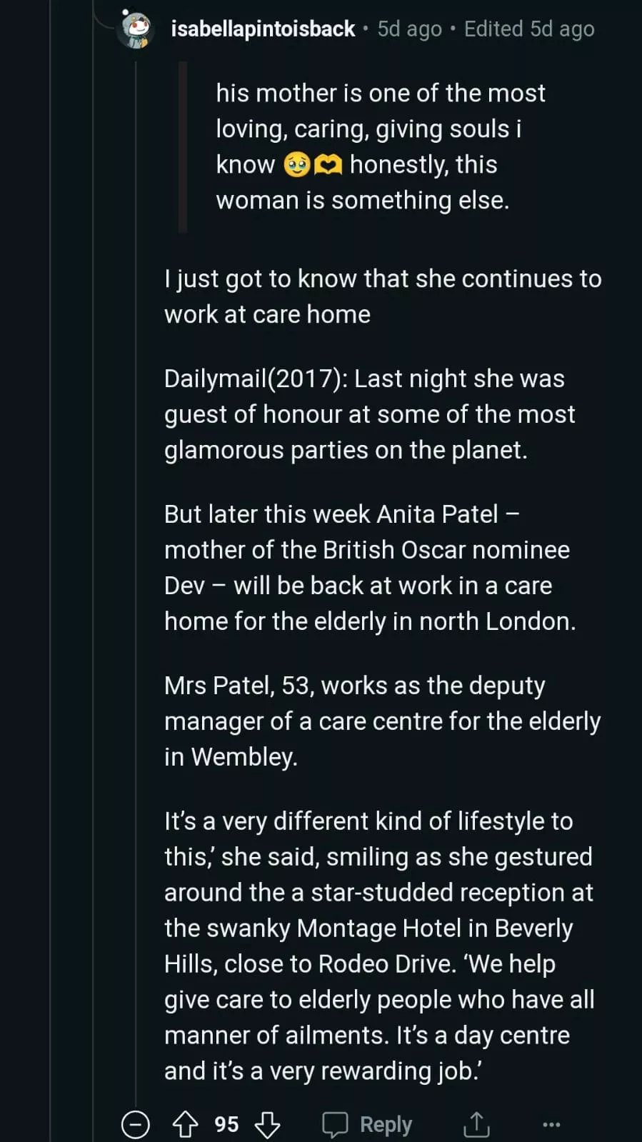 Soon, many other netizens started reacting to Dev Patel's wedding rumours. While one user shared a collage of Dev along with his mom and Tilda, another netizen commented, "Good for him, anything I hear about this man has been good. I hope he has a wonderful marriage."