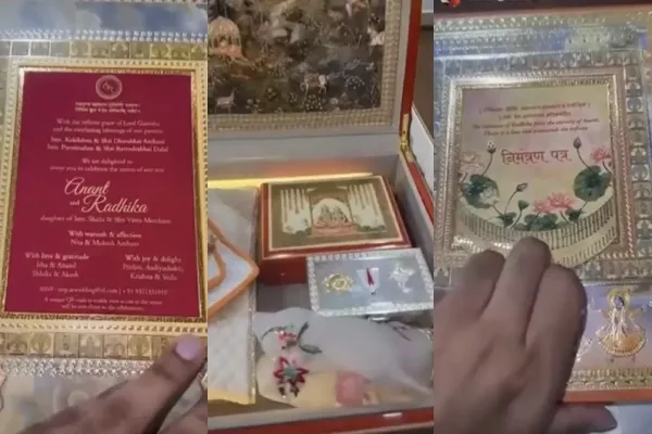 A few days ago, we got a couple of pictures from Anant and Radhika's lavish wedding invite. The card was in the shape of a red closet that contained a pristine silver temple inside it. Along with it, the yellow LED lights illuminated the temple, which again featured Lord Ganesha, Lord Krishna along with Radha, and Goddess Durga. Further, a silver invite with Lord Narayan's figurine was spotted on top of it, along with a few leaflets revealing the details of the grand wedding. Not only that, it contained a mesh-work mat and a handloom scarf, reportedly a Pashmina shawl packed in a white cloth.