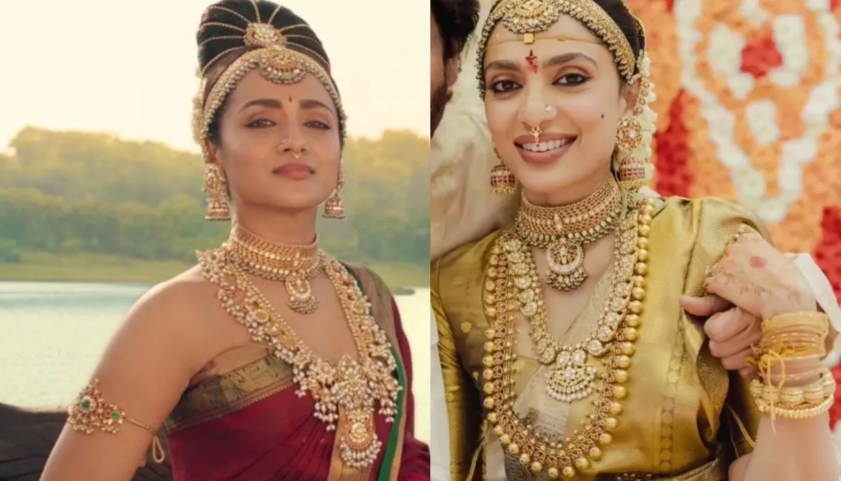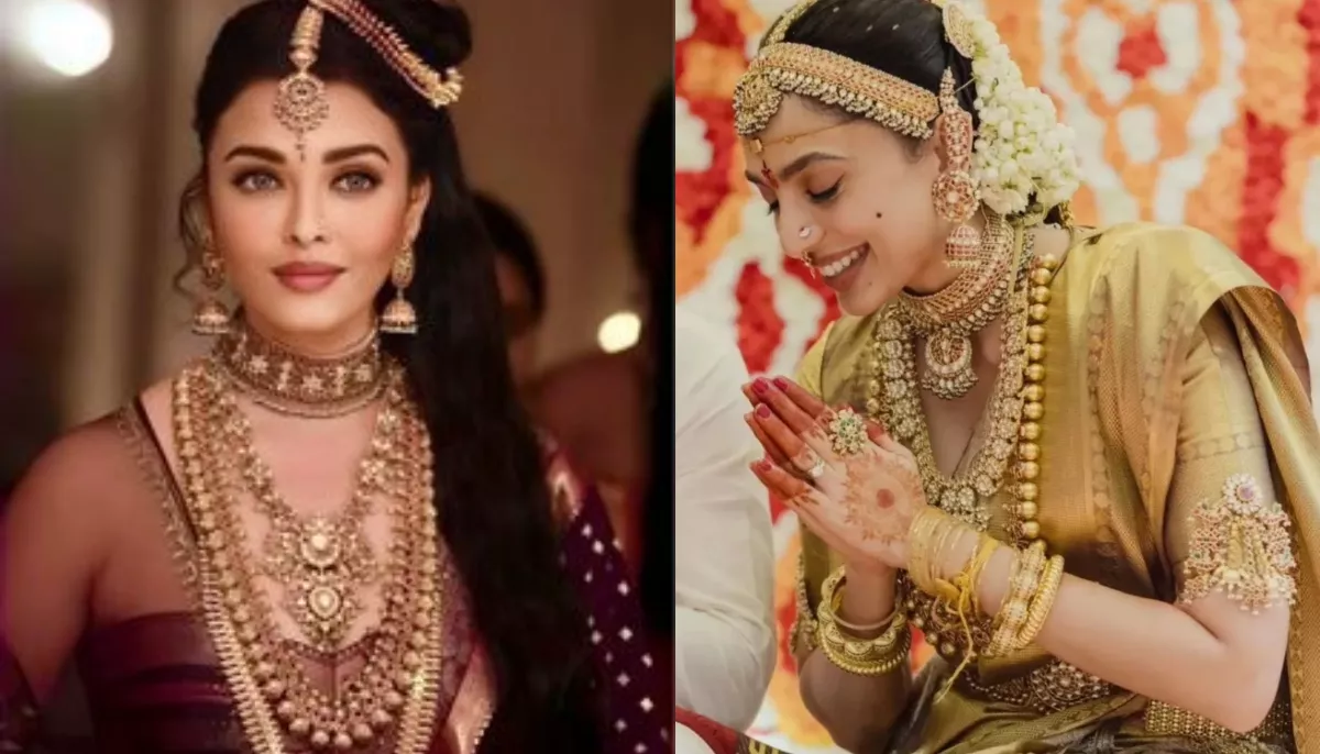 Sobhita Dhulipala was a vision decked in gold for her wedding. She wore a gold Kanjeevaram saree, which was reportedly designed by Neeta Lulla. Talking about her magnum jewellery, Sobhita honoured her Telugu roots as she wore real gold jewellery from head to toe. Coming to her accessories, Sobhita wore an array of necklaces, but two of them in specific shared uncanny resemblance with the jewellery worn by Aishwarya Rai and Trisha Krishnan in the film, Ponniyin Selvan: I.
