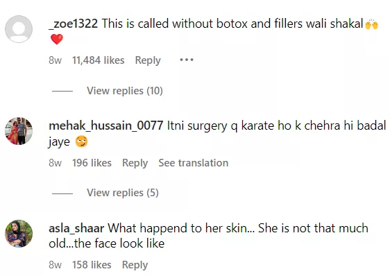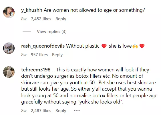 A major segment of Instagram users shared their thoughts on the natural beauty of Soha Ali Khan in the paparazzi video. One user said, “This is called without botox and fillers wali shakal.” Another one mentioned, “Pure beauty, this is how we should cherish and celebrate our ageing.” A third netizen penned, “This is exactly how women will look if they don't undergo surgeries botox fillers etc. No amount of skincare can give you youth at 50. Bet she uses best skincare but still looks her age. So either y'all accept that you wanna look young at 50 and normalise botox fillers or let people age gracefully without saying ‘Yukk she looks old.’”