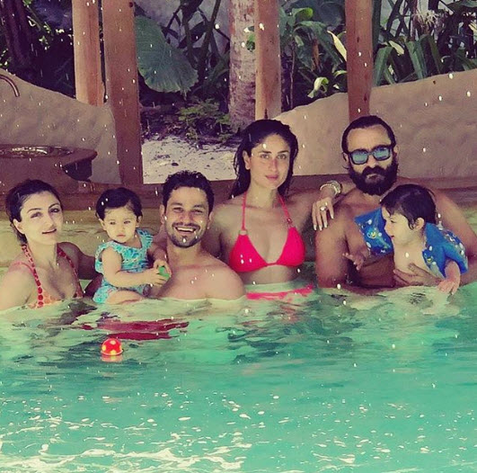 And here we have something for you which is sure to make you go all ‘oh-so-hot’! In a one-of-a-kind picture shared by Soha, you will spot the entire brigade of gorgeousness chilling at the pool with their babies. Soha captioned the picture as, “Make a splash! @discoversoneva #discoversoneva #familygoals”. And in another picture, Kareena and Kunal are seen spending a quality time with their babies and indulging in some ‘colour the picture’ session with their babies. Checkout the picture and do not tell us that we didn’t warn you! Here you go: