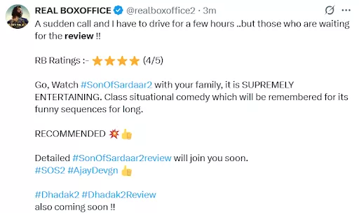 Fans have shared their verdict on the film. A user penned, "It's a wonderful movie, lots of comedy, lots of laughing moments, it's a complete family entertainer. A must-watch." Another wrote, "#SonOfSardaar2 Is Far Far Better Than For #SonOfSardaar Part 1. It's a completely family entertainer movie. #AjayDevgn Give a Sensational Performance. Everyone should watch this movie with family." A comment read, "A full-on #AjayDevgn show with desi comedy and family drama. #MrunalThakur looks stunning and delivers a solid performance. Some scenes feel stretched, but overall it's a fun ride that gives the same entertainment as part one."