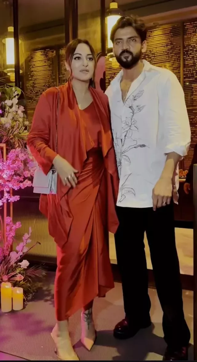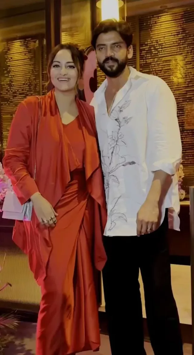 On June 26, 2024, the newly-married couple, Sonakshi Sinha and Zaheer Iqbal were spotted together by the paparazzi, as they stepped out for their first dinner date after marriage, along with their family members. The couple stopped and posed for the paparazzi. While Sonakshi donned a red-hued three-piece dress, Zaheer, on the other hand, sported a white shirt with black trousers.