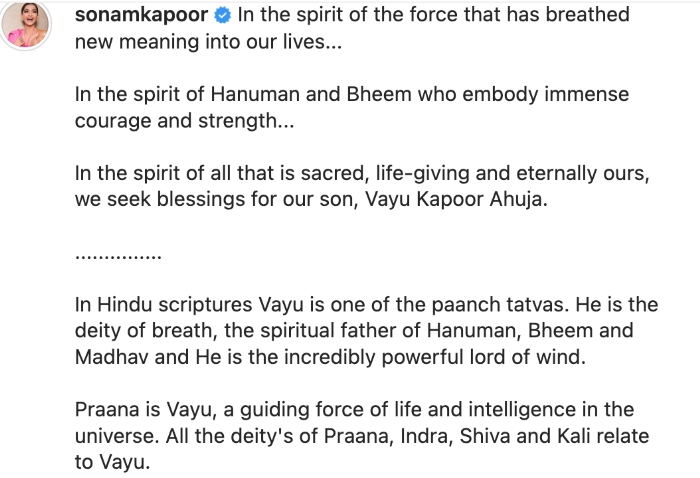 Sonam also revealed her baby's unique name, 'Vayu'. In a long post, Sonam revealed why she had chosen Vayu as her son's name. The actress shared that in Hindu scriptures Vayu is one of the paanch tatvas. Her long note can be read as: