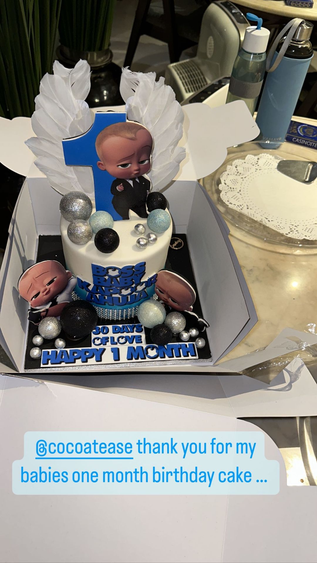 Sonam took to her Instagram stories and posted a cutesy picture of her baby boy's first-month birthday cake. In the picture, we can see a yummy 'Boss Baby' cake. It was decorated with a Boss Baby cake topper. Atop it was written, "30 days of love. Happy 1 month' with icing.