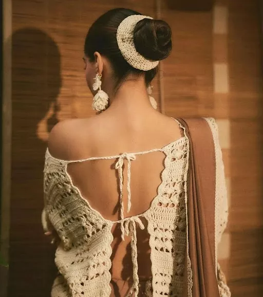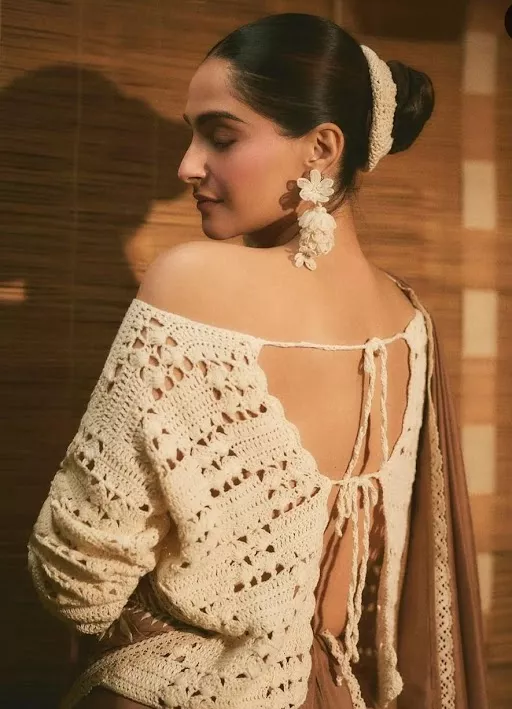 Sonam Kapoor donned a creme-hued crochet top from the shelves of Rajino Pyo, which cost Rs. 46, 600 thousand. The top featured a fall-shoulder design on one side and two tie-up detailing on the back, which held it together. Sonam paired the top with a brown-hued saree from the house of Masaba and completed her look with crochet earrings and hair accessories.