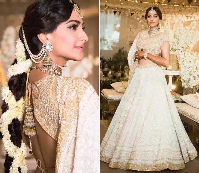 Sonam Kapoor was dolled up in an ivory AJSK lehenga for her mehendi. The backless choli was golden and had intricate embellishments. The actress' lehenga had several motifs-design made with golden zardozi and embroidered with crystals. She wore a matching chikankari dupatta with golden borders and looked like a dream for the ceremony.