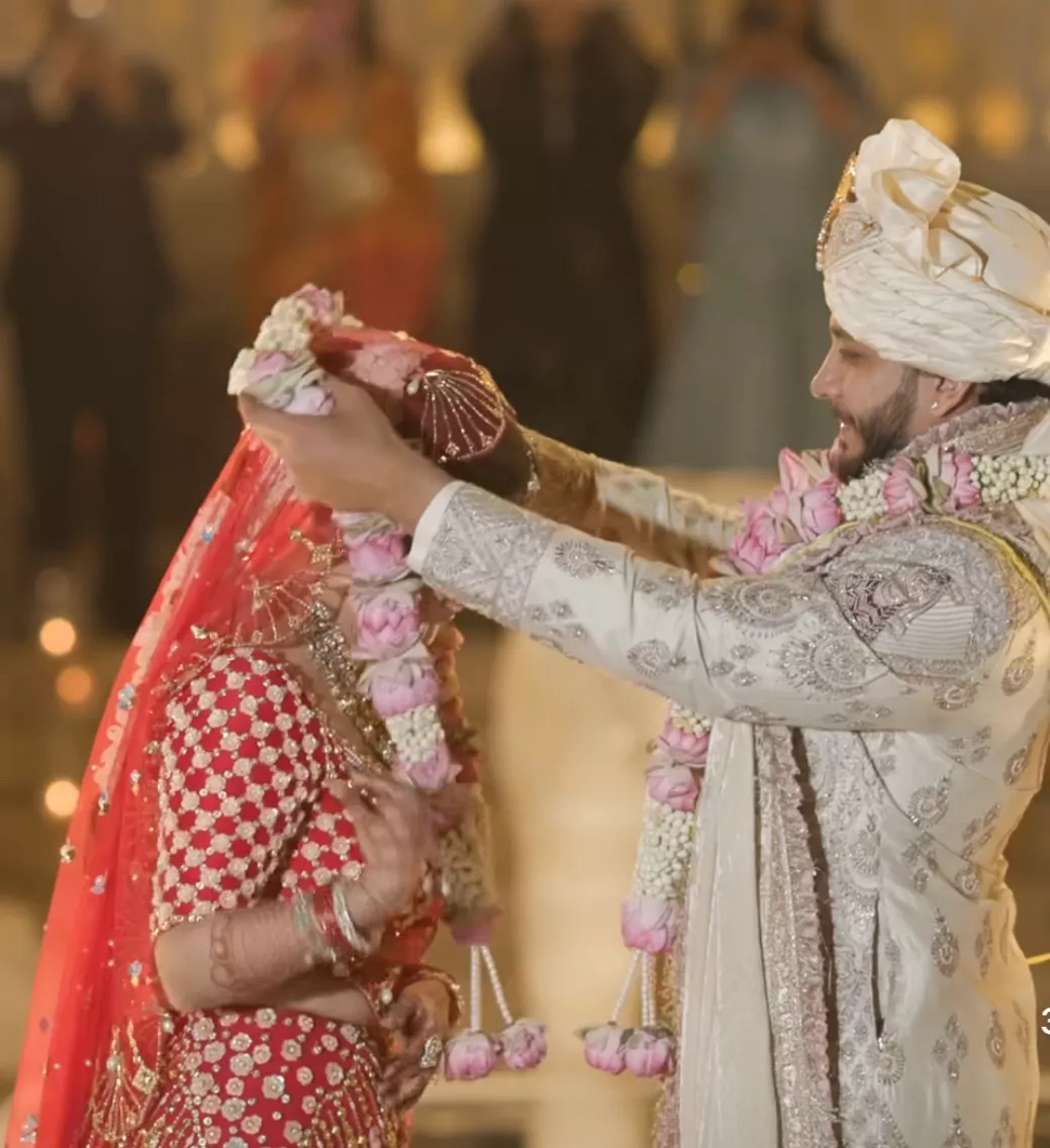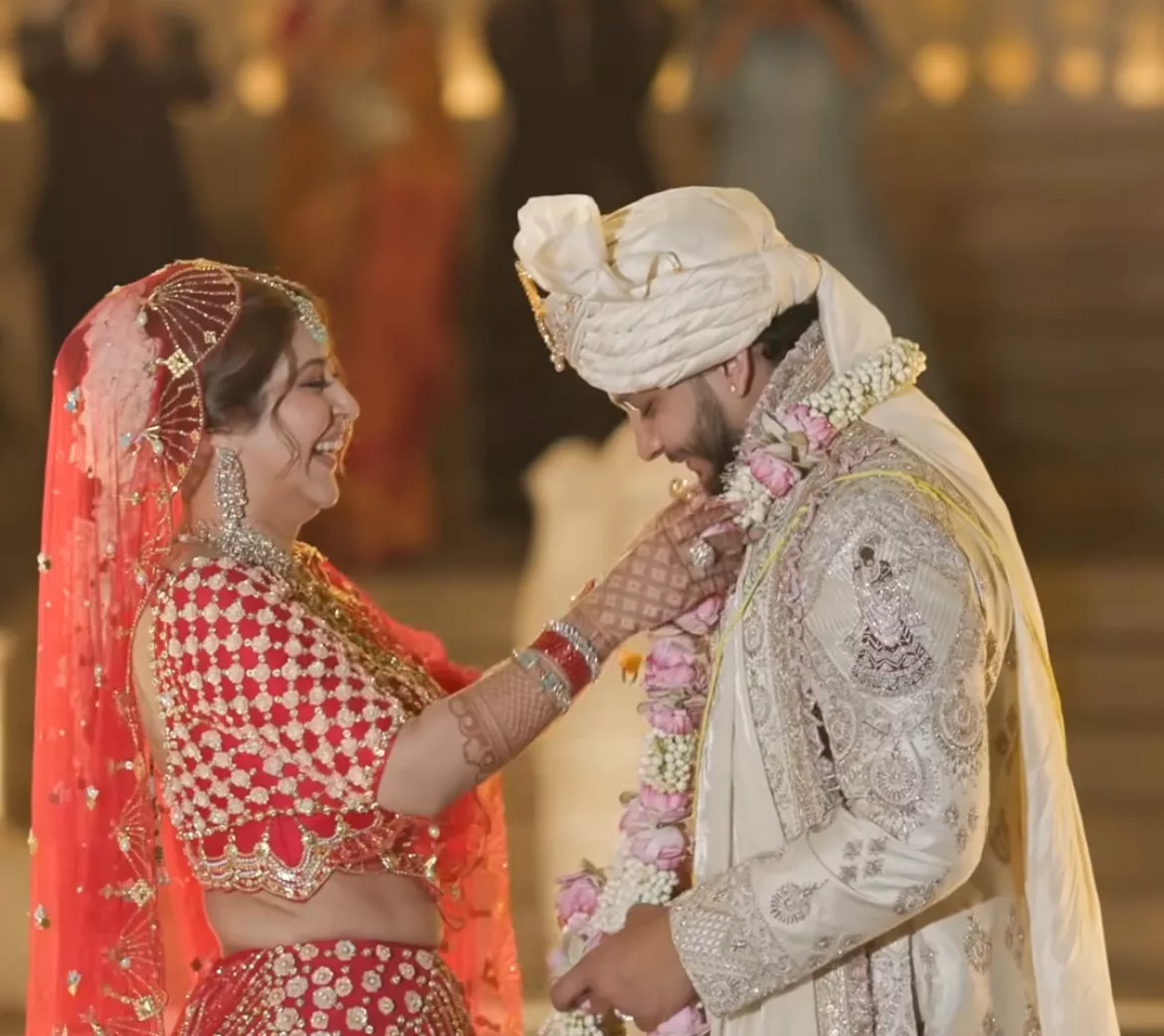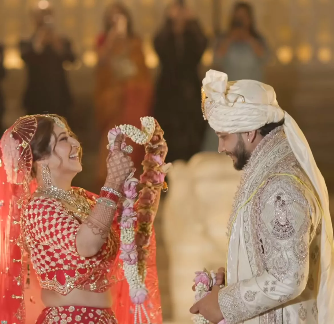 Sonarika completed her look with diamond jewellery, including a neckpiece, matching earrings, kadhas, and a maang teeka. Moreover, red chooda, gajra-adorned bun hairdo and rosy makeup added stars to her look. Meanwhile, the groom, Vikas donned a gold embroidered sherwani and matching pyjama paired with a beige-hued safa. The madly in love couple radiated pure happiness during their varmala moment. Moreover, the enchanting fireworks and the floral decoration at the venue stole our hearts in seconds!