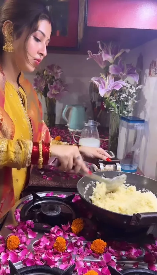 For her pehli rasoi, Sonarika made sooji halwa but with a twist. The diva added mango puree to her halwa and elevated the dosh by manifolds. Sonarika then served the halwa and garnished it with rose petals.