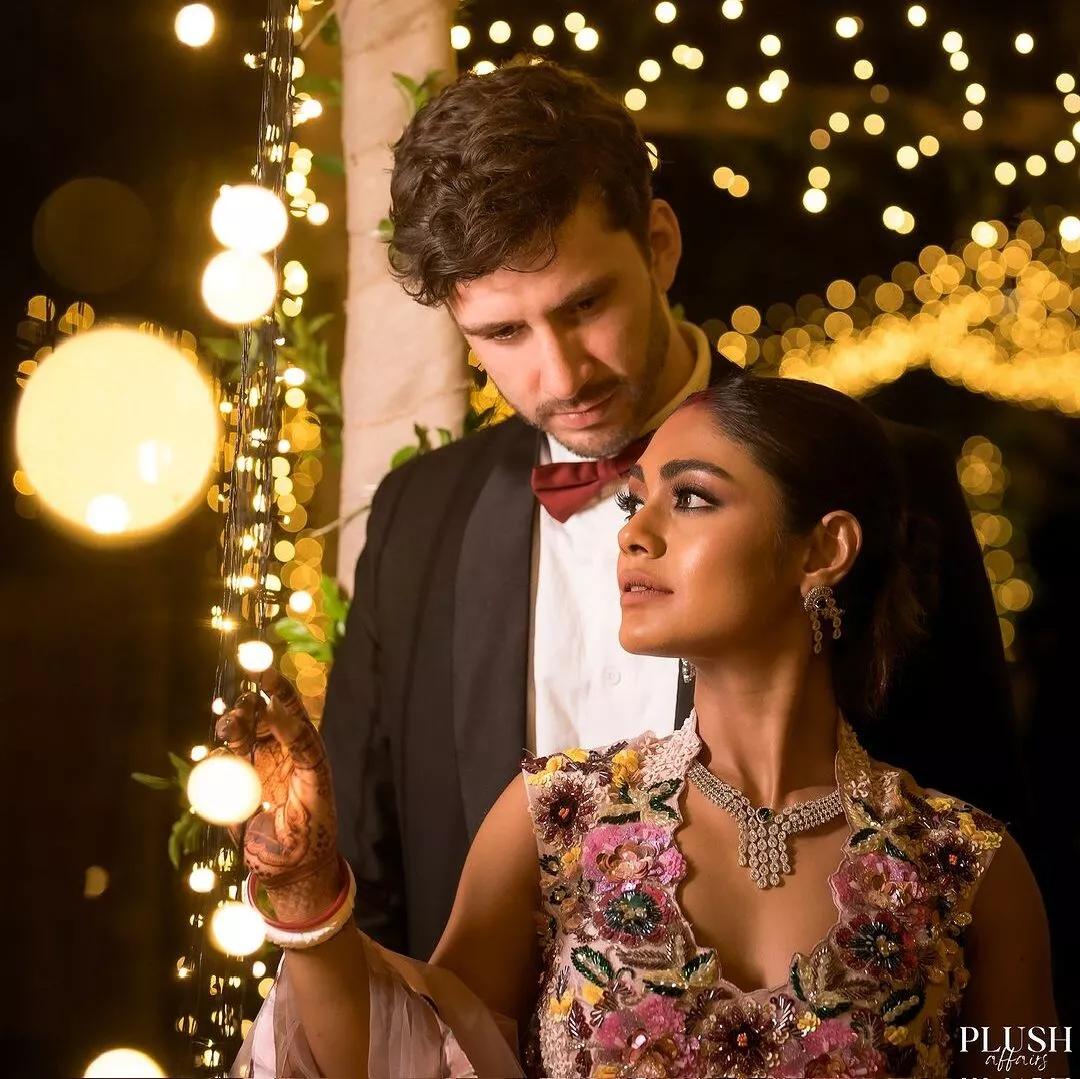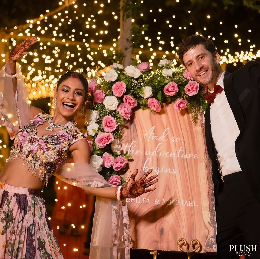 It's hard to figure out whether Sreejita's lehenga was inspired by her reception venue or vice versa. But let's just say that she couldn't have matched the ambiance any better, even if she tried. Yes, Sreejita De and Michael Blohm-Pape's reception was all about love, lights, and beautiful flowers. The entire venue was lit up with soft fairy lights that added to the romantic aura of the space. As did the floral decor in hues of pink, peach, and white that dotted the space. The venue also appeared to be outdoors, with a lot of greenery that added to its beauty.