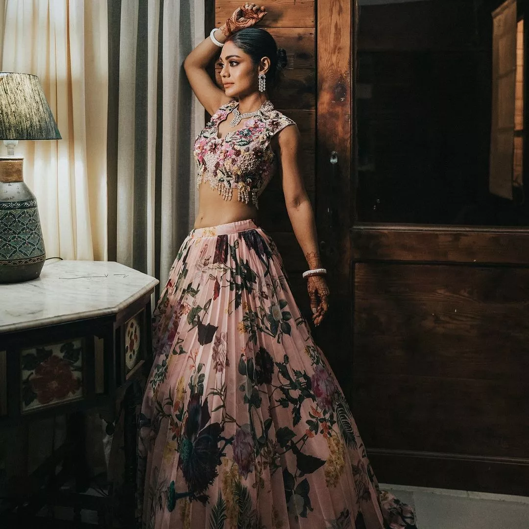 For the occasion, Sreejita looked every bit like a princess in a pink lehenga featuring a multicolored floral print. Her blouse was heavily embellished with floral embroidery, beads, and dangling sequin details. Its sleeveless and fitted silhouette perfectly balanced her flowy skirt. Sreejita's look was further elevated by her sheer dupatta . For accessories, Sreejita opted for a sparkly diamond necklace, statement earrings, and shakha-pola while her hair was done up in a classy bun. The dark red of mehendi further accentuated her traditional attire.