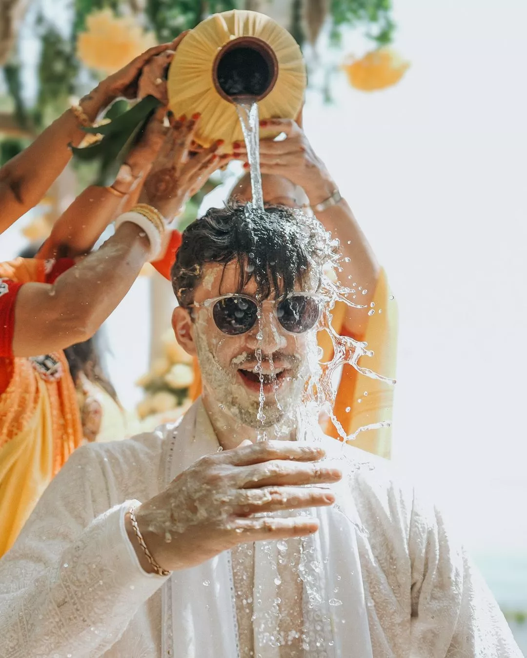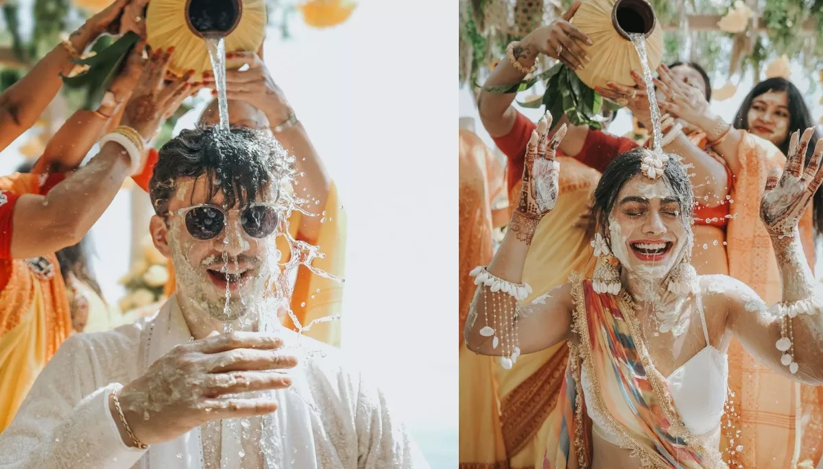 In a couple of photos, we can see the bride and the groom getting drenched in the haldi and milk. It was a beautiful moment and perfectly captured glimpses of the duo's most special day. Sharing the photos, Sreejita wrote: