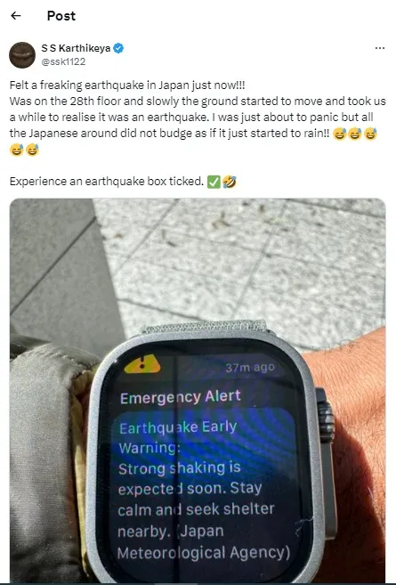 SS Karthikey also shared that when the earthquake hit Japan, it took him a minute or two to realise what was happening. Then, when reality dawned upon him, he was about to panic when the Japanese people around him were all relaxed, as if it was only raining outside. Karthikey even shared a picture of his smartwatch warning him about the earthquake.