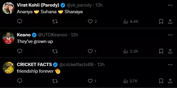 Well, 12 years ago, KKR defeated Chennai Super Kings on their home turf, M. A. Chidambaram Stadium, to nab their first-ever IPL title. An X (formerly Twitter) post by Mufaddal Vohra has been doing rounds on the internet, featuring Suhana Khan, Ananya Panday, and Shanaya Kapoor’s then and now pictures allegedly from the finals of IPL 2012 and 2024. In the throwback picture from twelve years ago, SRK, Hrithik Roshan, and Chunky Pandey were seen posing with very young Suhana, Shanaya, and Ananya. The latter was even seen wearing specs.