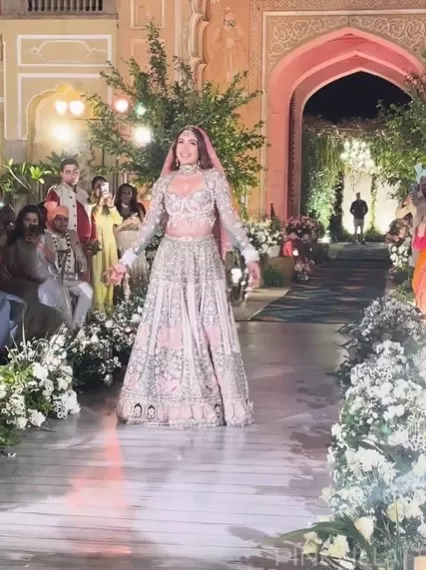 Taking to their IG handle, Pinkvilla dropped a special glimpse of Surbhi Chandna, right from the moment when she walked down the aisle. The video began with a surreal view of the wedding venue, that was decked up with an array of white flowers on either side. Surbhi could be seen walking down the aisle, while she did a happy dance on the song, Tujhe Aaj Apni Ibadat Banaye. Talking about her wedding attire, the actress looked resplendent in a silver lehenga, that featured baby pink-hued embellishments in contrast.