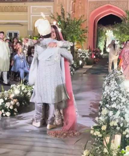 She paired it with a custom-cut, full-sleeved choli, that included a sweetheart neckline and tassel detailing near the torso. Surbhi’s bridal look was completed with a baby pink-hued dupatta with a long trail. Keeping her tresses open, she opted for minimal makeup. A statement choker, matching maang-teeka, white chooda and golden kaleeras completed her look. On the other hand, Karan donned a silver-hued sherwani, teamed with a matching pyjama, angrakha and doshala. He wore a white turban to complete his look. As Surbhi approached Karan, the duo embraced each other in a tight hug and they held hands to reach towards the mandap.