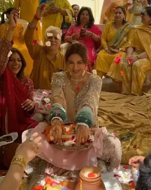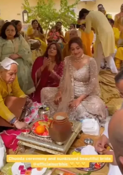 Earlier today, we came across happy glimpses from Surbhi Chandna's chooda ceremony. For the event, the bride-to-be opted for a champagne gold-hued sequinned lehenga, paired with traditional jewellery. Subtle makeup and a middle-parted bun hairdo completed her look. The diva radiated sheer happiness during the ritual, as she was surrounded by her friends and family members.