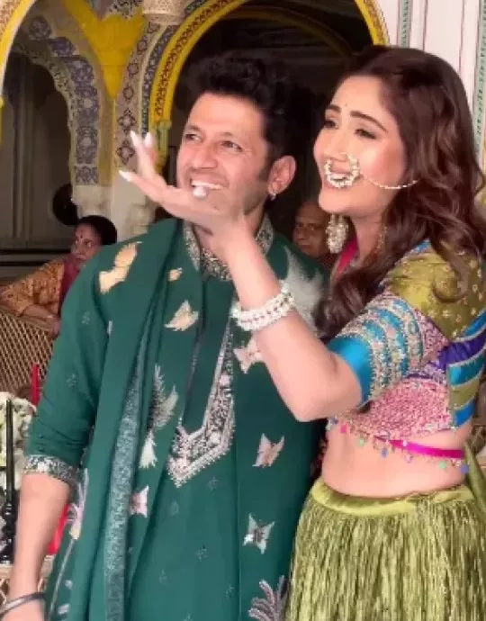 For her mehendi ceremony that took place on March 1, 2024, Surbhi Chandna opted for a boho chic look to commemorate the festivities. Her outfit included a henna green-hued lehenga, which she teamed with a royal blue-hued choli, that featured golden embroidery. She pinned a dupatta on one side and completed her look with a chunky jewellery pieces, that included a big nose ring, huge chandbaalis and kadas. The actress opted for a sleek and minimal mehendi design. On the other hand, her fiance, Karan, looked handsome in a green-hued ensemble.