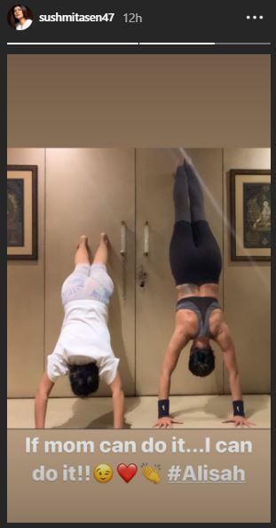 Whether it is Renee’s singing skills or Alisah’s confidence when she recites a Marathi poem, the doting mother never skips a chance to capture those moments in her camera. The actress is spending self-quarantine with her kids, Renee and Alisah. On April 6, 2020, Sushmita Sen had taken to her Instagram stories and had posted a picture of herself, doing a handstand with her daughter, Alisah during their self-quarantine. Looking at the picture, it tells us that Alisah is strong and have bones of steel just like her mother, Sushmita Sen. Along with the inspiring picture, Sushmita had written a short caption motivating her daughter, and it could be read as “If mom can do it, I can do it!! #Alisah.” Take a look.