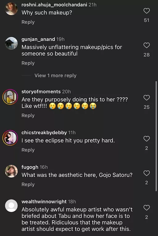 Soon after the post was shared on social media, several netizens expressed their dissatisfaction over the same. Reacting to Tabu's look, a user commented, "Massively unflattering makeup/pics for someone so beautiful." Another penned, "Why such makeup?" Meanwhile, a third netizen wrote, "Everything except Tabu is entirely wrong here." Check out the comments below: