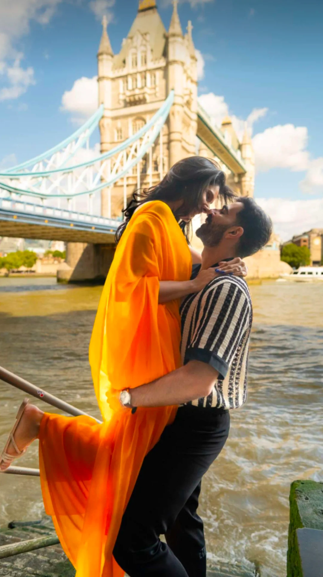 In the pictures, Nidhi is dressed in a yellow-hued chiffon saree, which she paired with a white-toned cowl-neck off-shoulder blouse. She kept her tresses open and completed her look with subtle makeup and strappy flats. Mohak, on the other hand, donned a black-and-white striped shirt with black trousers as he went down on his knee to propose to Nidhi, with the iconic London Bridge as their backdrop.