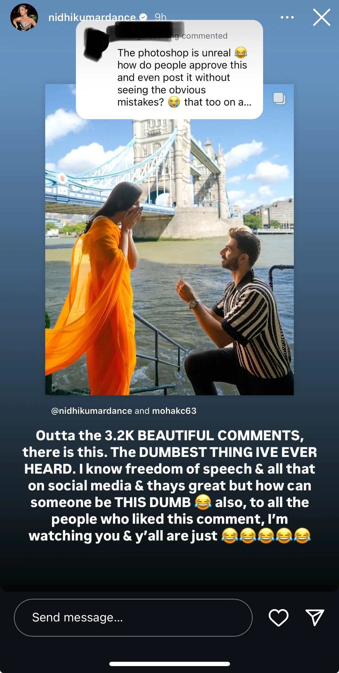 While congratulations poured in after Nidhi shared her proposal pictures, certain people accused the duo of photoshopping the pictures. Some even called the London backdrop fake. A user wrote, "Lol. This is hilarious. People are so desperate and stupid for SM validation. Imagine photoshopping your very normal proposal photos." Another user commented, "The entire photo has jagged edges, the photoshop is that bad. It's not even trying to hide anything. Is she aware that you can't lie about these things? Technology works faster than her influencer-sized brain ???"