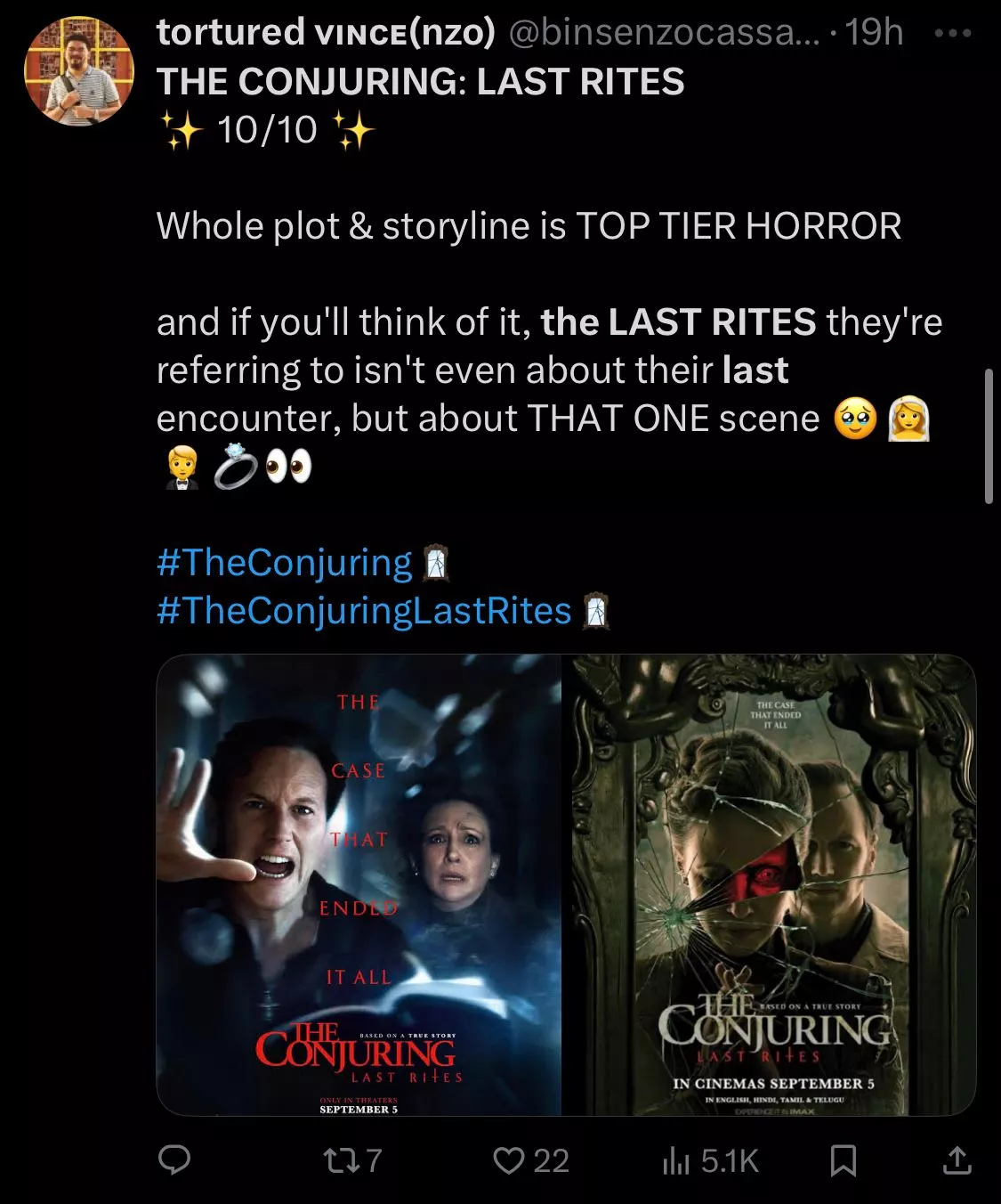 Despite lukewarm critic scores, The Conjuring: Last Rites has resonated well with audiences. A user on X (formerly Twitter) commented,"The conjuring last rites concludes brilliantly!", another one said,"The Conjuring:Last Rites had me all over the place". A third user said, "The Conjuring: Last Rites10/10. Whole plot and storyline is Top Tier Horror."
