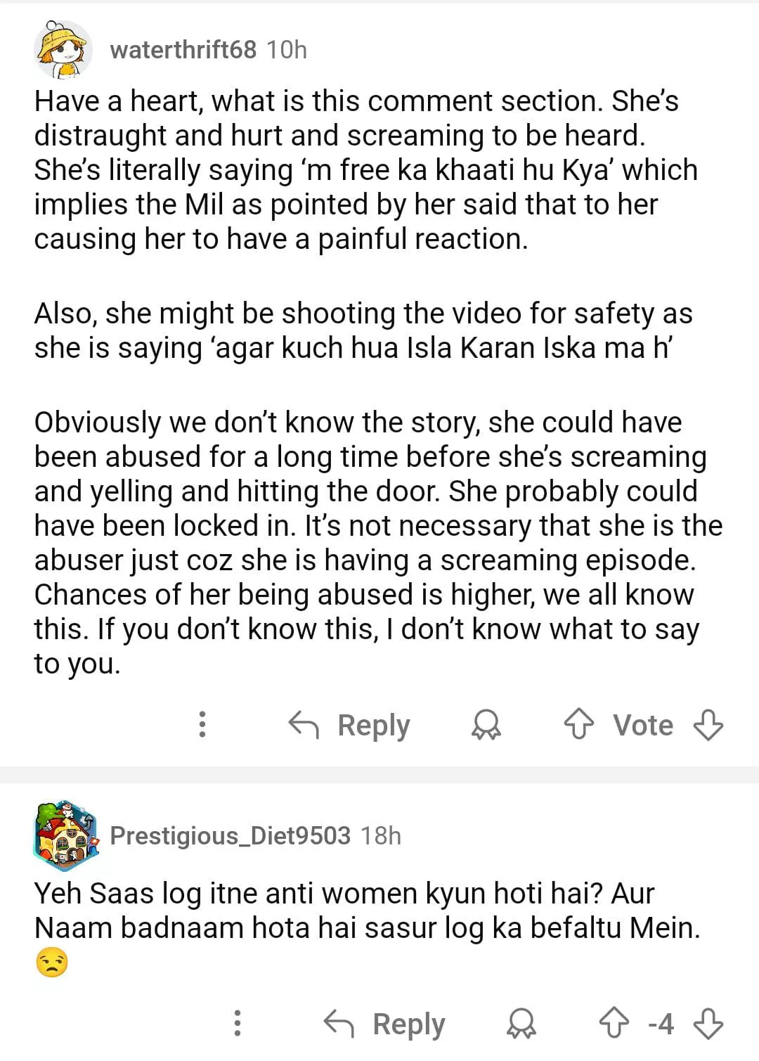 There is another section of audience who want people to have a kind heart and sympathise with the situation of the lady. They felt she was broken, hurt and hence was screaming. They noted her comment on ,'Mei free ka khaati hu kya' and they thought that her mother-in-law may have implied to her causing her a painful reaction.