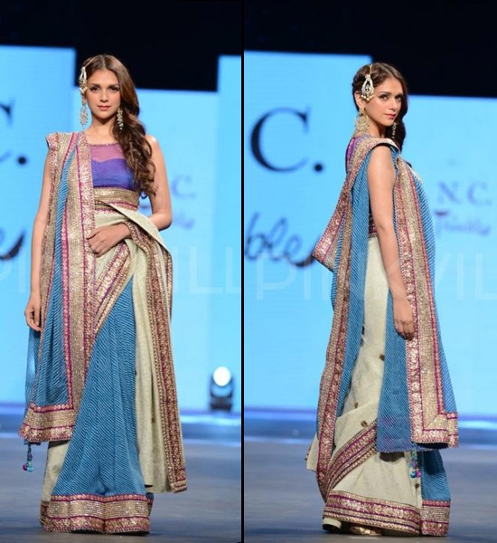 Aditi walked down the ramp in this Shaina NC saree at the ninth annual Caring With Style fashion show for the CPAA (Cancer Patients Aid Association). The jhoomar and chandelier earrings are the only standout accessories, and they perfectly complement the look. This outfit will be ideal for attending your best friend’s mehendi or sangeet night.