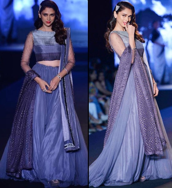 She sashayed down the ramp to the melodious tunes of Afsana Likh Rahi Hoon from the film, Dard (1947) in the prettiest grey lehenga choli combo with a dupatta, which almost resembled a starry night sky. Debarun Mukherjee stated that Aditi was one of his muses for this collection, which was inspired by the evolution of filmy costumes over the past few decades in the Hindi film industry.