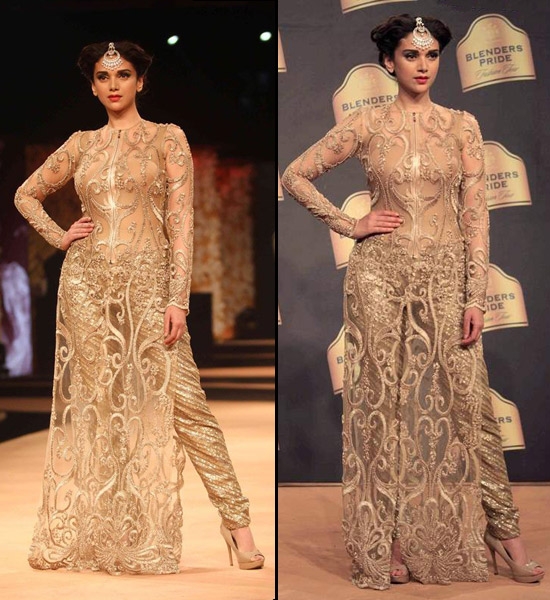 Aditi stunned everyone in this Neeta Lulla creation. The beautiful golden kurta and churidar looks gorgeous and elegant. Her fabulous maang tikka was enough to accessorise the whole look so as not to take the attention away from the rest of the ensemble.