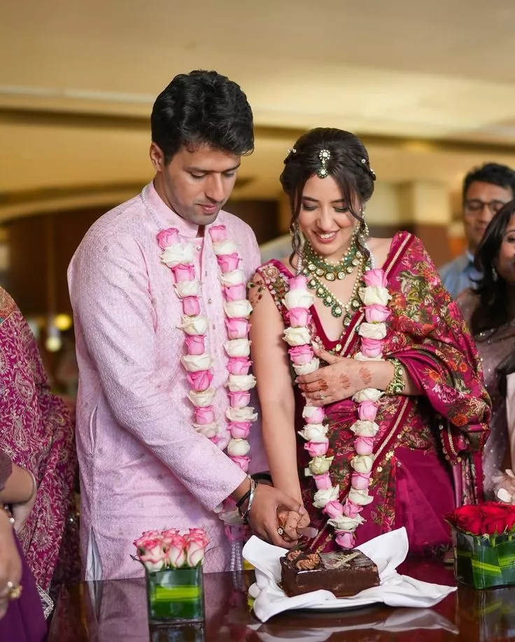 For the day, Tanya wore a pink floral saree from Gazal Gupta. The saree has intricate floral work with an amazing 3D floral blouse. She paired it with diamond, pearl and gemstone studded jewellery featuring a necklace, maang teeka, bracelet and earrings. However, the cherry on the cake was her unique braided bun hairstyle. Tanya looked the happiest as she signed into her forever journey with Eshaan, as the duo posed for the lenses.