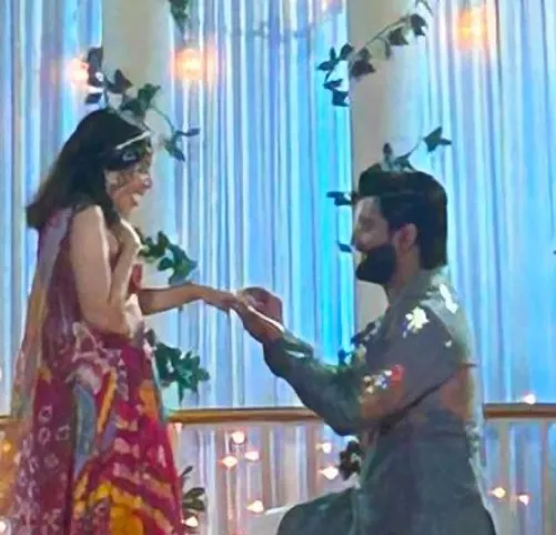 Recently, a photo started making rounds on social media, showing Uorfi and a mystery man, seemingly in the middle of a ring ceremony. Uorfi was seen in a pink flared skirt and a matching tube top with large colourful floral and bandhani prints all over. Her outfit is complemented by a sheer, patterned dupatta draped over the shoulders. Uorfi’s look was accessorised with a bejewelled headband and large earrings, adding a playful and stylish touch to the look. Her mystery man was seen wearing a grey-hued suit with floral embroidery on the lapel and pocket area.