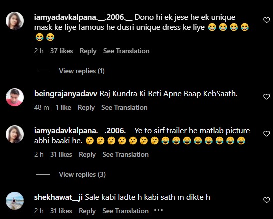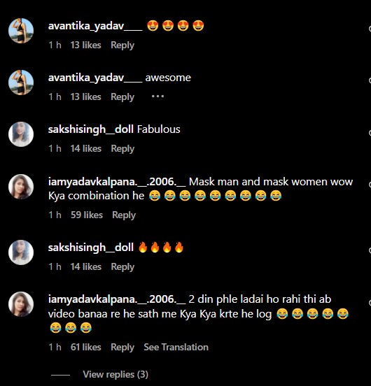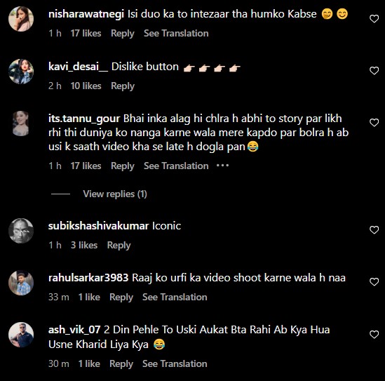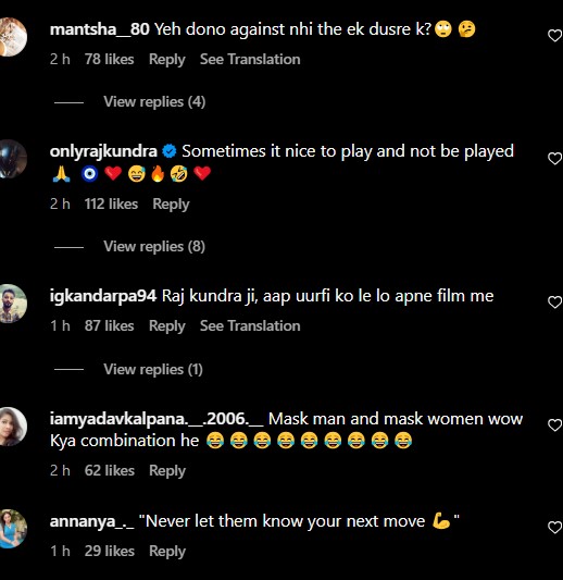 As soon as Uorfi psoted the video, netizens rushed to the comment section to drop their opinions. While some users remained stunned with Uorfi and Raj's twinning outfits, others seemed confused about the same. Reacting to the video, one user wrote, "Mask man and mask women wow Kya combination he," while another user commented, "2 din phle ladai ho rahi thi ab video banaa re he sath me Kya Kya krte he log." A third comment can be read as "Huh? So the story you posted about him the other day and calling him p*rn king was a part of marketing too??"