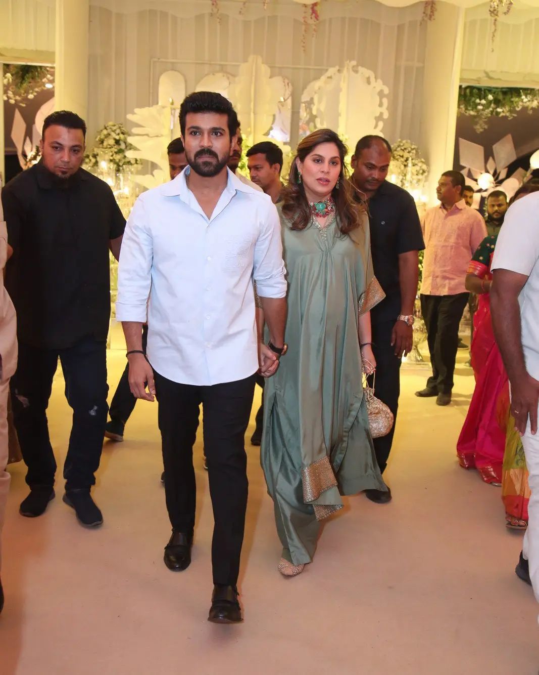 On June 9, 2023, Upasana Kamineni graced Varun Tej and Lavanya Tripathi's engagement ceremony along with her hubby, Ram Charan. For the event, she looked gracious in a green kaftan and was seen flaunting her baby bump as she clicked inside the venue. She teamed her look with a multi-hued stone-embellished choker, matching earrings, golden shimmery jootis and a potli. In addition, she opted for subtle makeup, including blushed cheeks, glossy pink lips, kohl-rimmed eyes and an open hairdo. On the other hand, Ram looked handsome in a crisp white shirt paired with black pants.