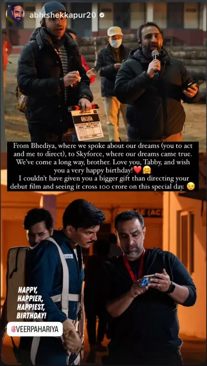 “From Bhediya, where we spoke about our dreams (you to act and me to direct), to Skyforce, where our dreams came true. We’ve come a long way, brother. Love you, Tabbym and wish you a very happy birthday! I couldn’t have given you a bigger gift than directing your debut film and seeing it cross 100 crore on this special day.”