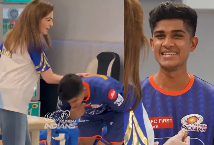 Courtesy of his exceptional bowling performance on his debut IPL match against such a strong side, Vignesh Puthur received the 'Best Bowler' award on the night. The youngster received the award from the co-owner of Mumbai Indians, Nita Ambani. The left-arm wrist spinner received a special pin from Nita Ambani to put on his T-shirt. After receiving the award, Vignesh touched Nita Ambani's feet, which speaks volumes about his upbringing and culture.