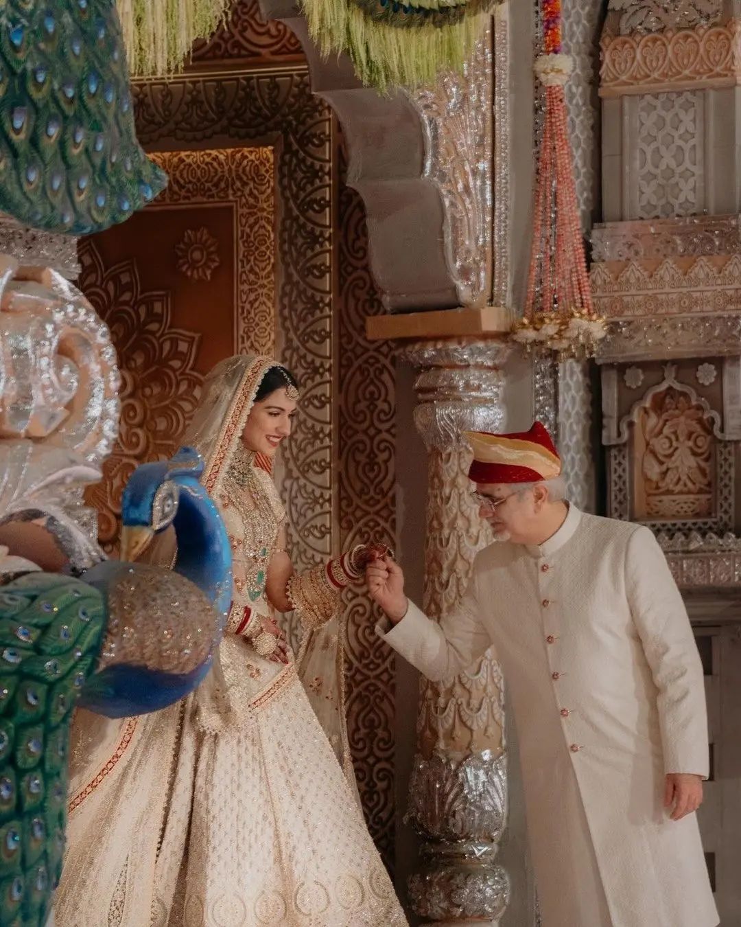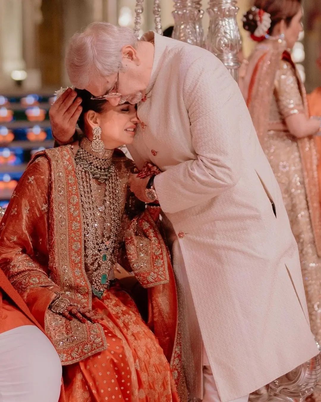 Leaving her parents' home forever after getting married, is surely an emotional moment for every bride, and Radhika Merchant was no exception. In a video that went viral, we could see her shedding tears while doing the vidaai rituals. And now, an adorable photo from the vidaai ceremony surfaced online. In the photo, we can see Radhika's father, Viren Merchant, consoling his daughter, who was in tears. And this photo was all things heartfelt. In another photo, we can see Viren Merchant escorting his daughter, Radhika towards Anant Ambani as she was all set to exchange vows with him.