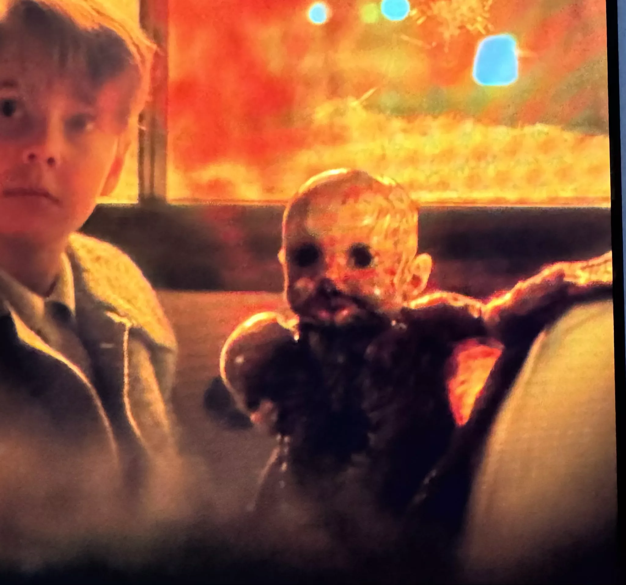 'Matty' blames them for being trapped in the movie in the first place. As the movie slows down, the image darkens, the song warps, and 'Matty' looks up at them with an evil grin as the baby he's holding leaps out through the movie screen and into the real world. The little child turns out to be the 'Pennywise' flying demon baby that killed 'Matty' at the beginning of the episode, and now it's loose inside the theater.