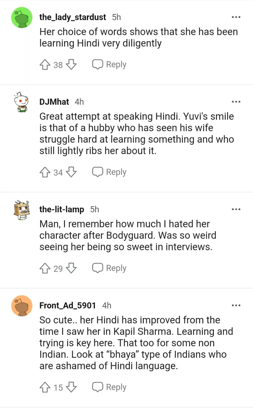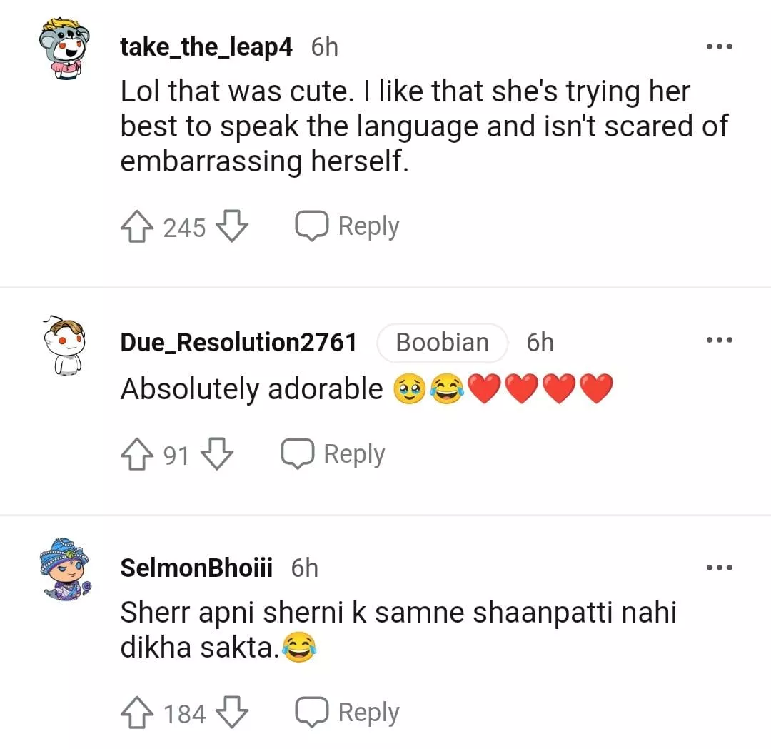 "So cute.. her Hindi has improved from the time I saw her in Kapil Sharma. Learning and trying is key here. That too for some non Indian. Look at “bhaya” type of Indians who are ashamed of Hindi language."