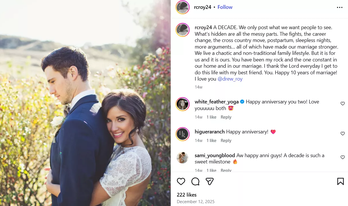 "A DECADE. We only post what we want people to see. What’s hidden are all the messy parts. The fights, the career change, the cross-country move, postpartum, sleepless nights, and more arguments… all of which have made our marriage stronger. We live a chaotic and non-traditional family lifestyle. But it is for us, and it is ours. You have been my rock and the one constant in our home and in our marriage. I thank the Lord every day I get to do this life with my best friend. You. Happy 10 years of marriage! I love you."