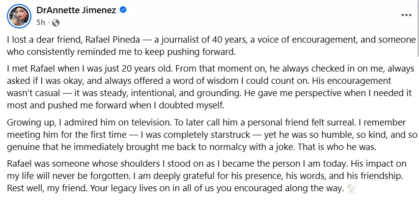 Rafael Pineda's friend, Dr Annette Jimenez, also penned a heartfelt note for her 'dear friend'. She shared that she met Rafael when she was 20 years old, and he always checked in on her and made sure she was okay, offering words of wisdom. Annette called Rafael's words steady, intentional and grounding. She revealed that Rafael would always give her perspective when she needed a push or when she doubted herself. She added: