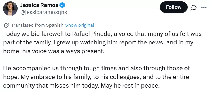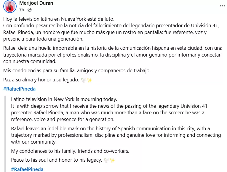 News of Rafael Pindea's demise started to make headlines on January 26, 2026 (ET). Once the news was confirmed, an outpouring of tributes from Latino journalists and media figures across the tri-state area began flooding social media. Many of whom credited Rafael Pineda as a mentor, role model, and steady presence in Spanish-language news for generations of viewers. Journalist, Merijoel Duran expressed his grief over the legendary news reporter's passing and said, "Latino television in New York is mourning today."